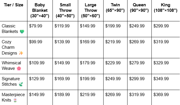 Prices vary depending on both the size and the tier of your blanket. Larger blankets and more intricate designs naturally cost more, so this guide helps you see what to expect and choose the perfect blanket for your space and budget.